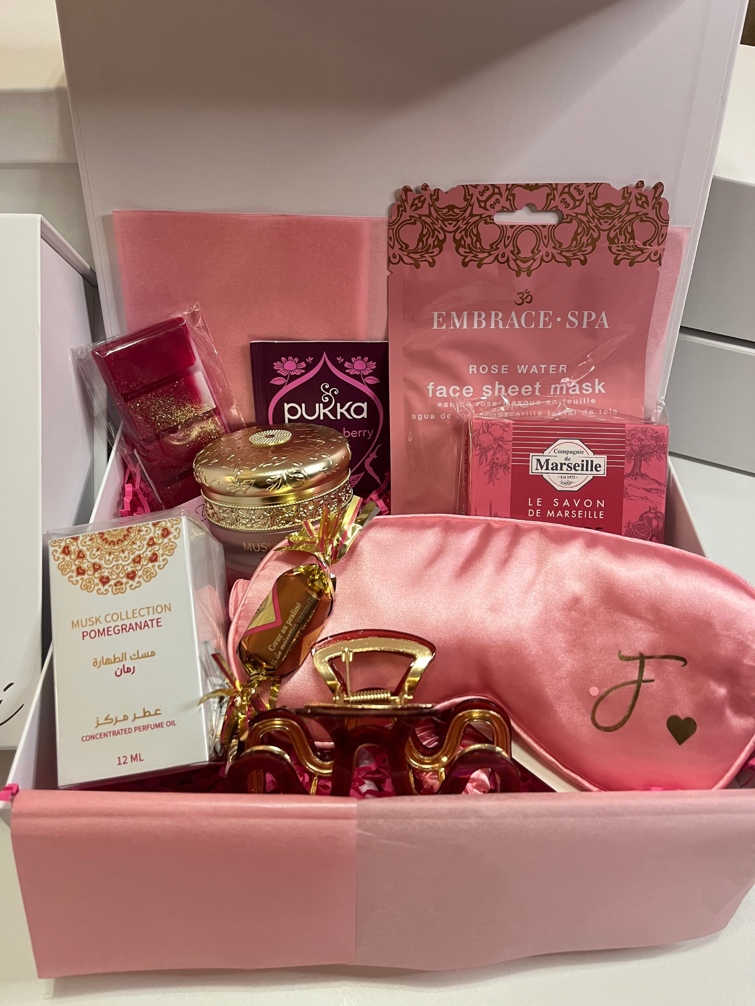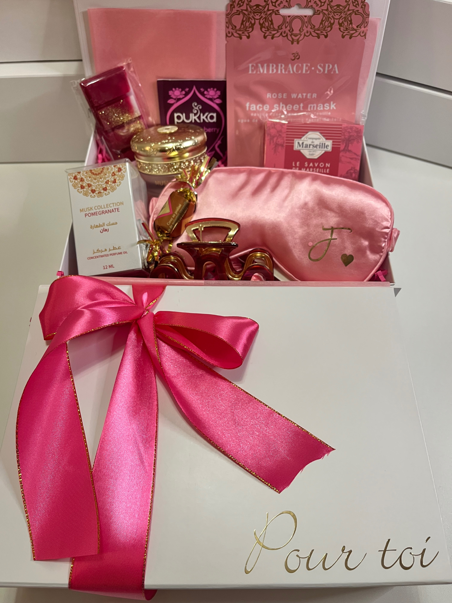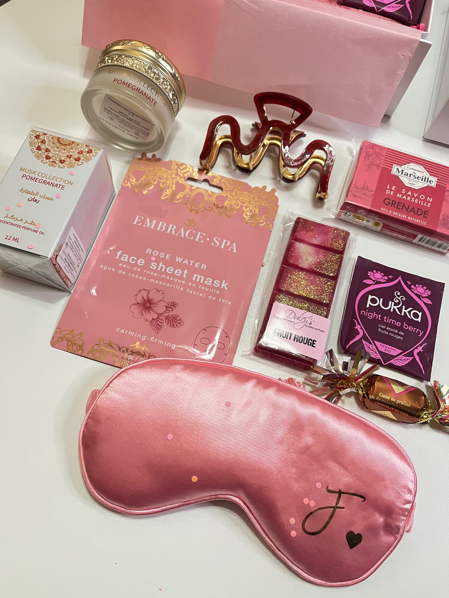 Le coffret est emballé dans une boîte blanche rigide à fermeture magnétique, ornée d’un ruban satin. La personnalisation est possible : inscription prénom ou initiales sur la box et une initiale sur le masque satin. Mesure du coffret : 22 x 22 x 10 cm ou 26 x 19 x 8. Pas besoin d'emballage supplémentaire.